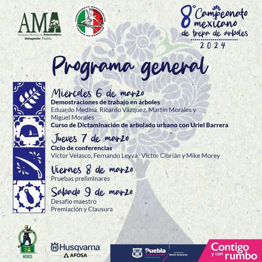 Finamente, Edith Castañeda, Delegada de la AMA en Puebla, ahondó que como parte del Campeonato se realizarán demostraciones en el uso correcto de herramientas de sierras y cableado, exámenes de certificación para arboristas, trepa infantil de árboles, foros de poda, derribo y normatividad de vegetación, así como sobre el cuidado hábitats urbanos, entre otras actividades.