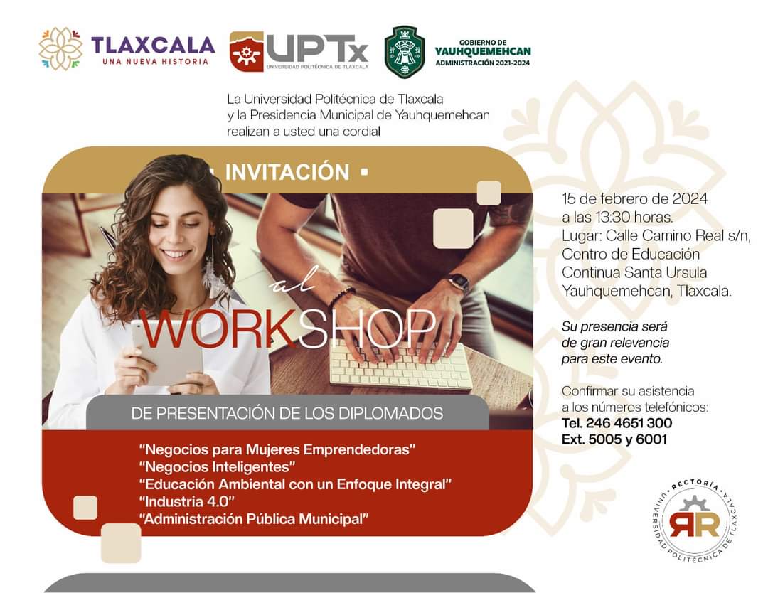 ATENCIÓN LA UPTX Y EL GOBIERNO DE YAUHQUEMEHCAN INVITAN A LOS DIPLOMADOS Publicado porEXPRESION14 de febrero de 2024Publicado en Edo Tlaxcala, Educación, Noticias, Yauhquemehcan 14 DE FEBRERO 2024 Atención la ##UPTx y el Gobierno de Yauhquemehcan 2021-2024 invitan a esta magna presentación de diplomados este 15 de febrero, en el Centro de Educación #UPTx Santa Úrsula Zimatepec. Los esperamos. BienestarQueFluye Comparte esto: Haz clic para compartir en X (Se abre en una ventana nueva) X Haz clic para compartir en Facebook (Se abre en una ventana nueva) Facebook Me gusta Cargando... Relacionado