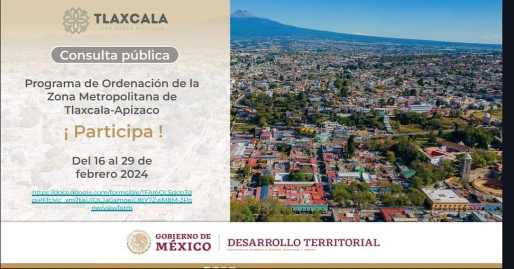 a consulta pública el Programa de Ordenación de la Zona Metropolitana de Tlaxcala-Apizaco, participa del 16 al 29 de febrero 2024.