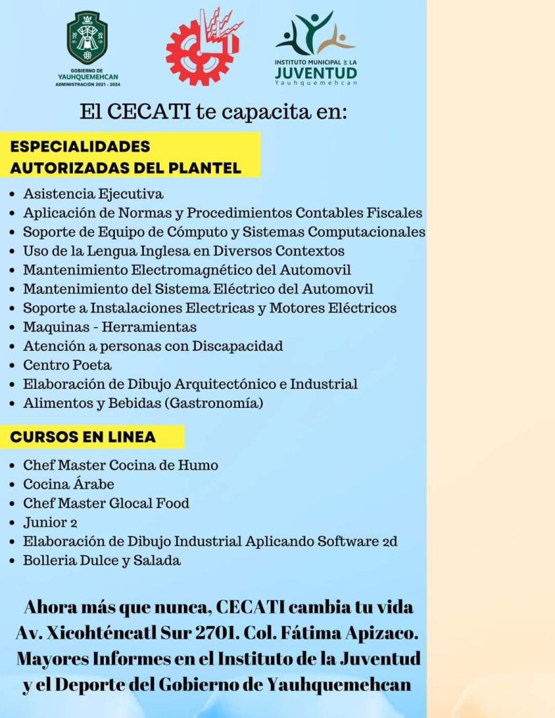 El Gobierno de Yauhquemehcan 2021-2024 Ia través del Instituto de la Juventud y el Deporte Municipal, acercan a la ciudadanía, especialidades y cursos en linea del CECATI 29.