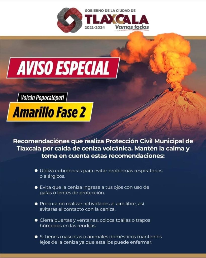 El Ayuntamiento de Tlaxcala, a través de la Coordinación de Protección Civil emitió una serie de recomendaciones ante el incremento de actividad del Volcán 🌋 Popocatépetl.