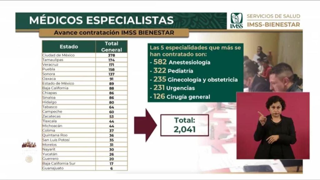 El director general del IMSS agregó que, en los estados que se han sumado a la federalización de los servicios de salud, se han contratado 2 mil 41 médicos especialistas, de los cuales 44 de ellos se encuentran en Tlaxcala, brindando atención a la población en especialidades de anestesiología, pediatría, ginecología y obstetricia, urgencias y cirugía general, que son las cinco especialidades de más demanda.