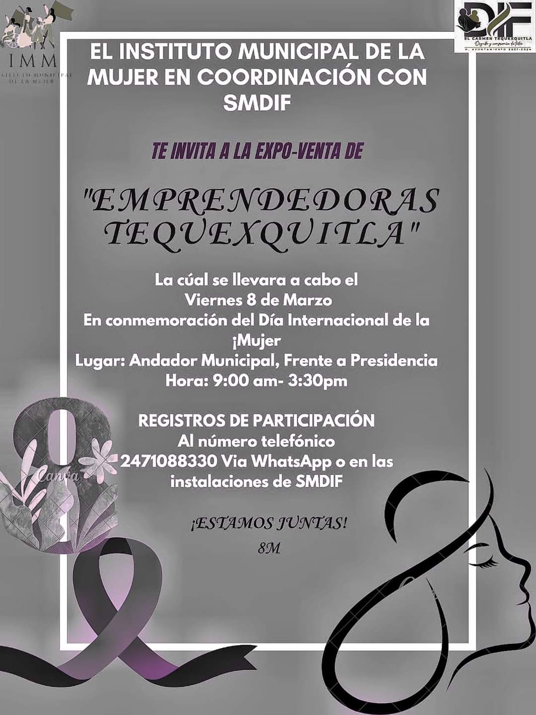 El Instituto Municipal de la Mujer invita a participar en la expo- venta «EMPRENDEDORAS TEQUEXQUITLA». ¡Inscríbete y participa! ¡Estamos juntas!