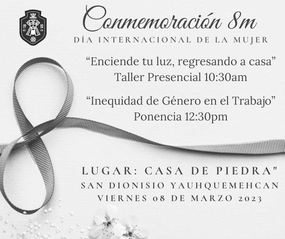 El instituto municipal de la mujer , invita a las ciudadanas de Yauhquemehcan, este viernes 8 de marzo en conmemoración del día internacional de la mujer, al taller presencial «Enciende tu luz regresando a Casa» y a la ponencia «Inequidad de Género en el Trabajo». Las esperamos.