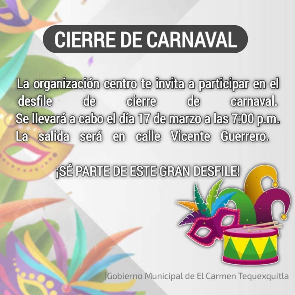 Gran cierre de carnaval, invita la organización centro, el próximo 17 de marzo a las 7:00 p.m. ¡NO FALTES!