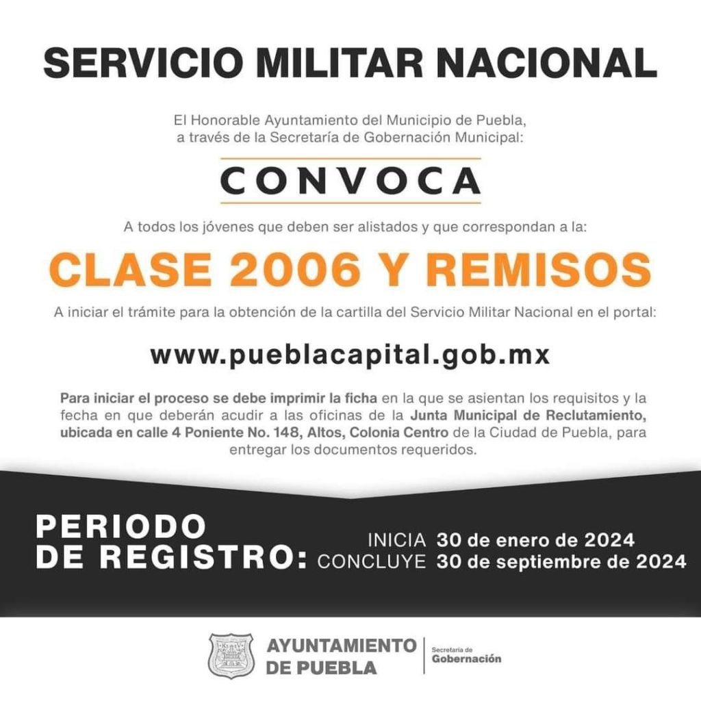 El Ayuntamiento de Puebla, a través de la Secretaría de Gobernación Municipal, informa que la convocatoria para tramitar la Cartilla del Servicio Militar ya se encuentra abierta para jóvenes pertenecientes a la Clase 2006 y remisos.
