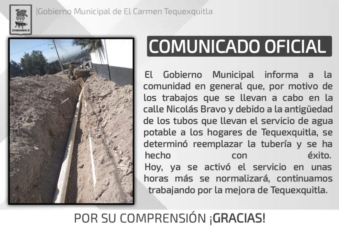 SE RESTABLECE SERVICIO DE AGUA POTABLE EN TEQUEXQUITLA Publicado porEXPRESION18 de marzo de 2024Publicado en Edo Tlaxcala, Tequexquitla 18 DE MARZO 2024 ️⃣#COMUNICADOOFICIAL, YA SE HA RESTABLECIDO EL SERVICIO DE AGUA POTABLE. 😌 POR SU COMPRESIÓN ¡GRACIAS! 😌 Comparte esto: Haz clic para compartir en X (Se abre en una ventana nueva) X Haz clic para compartir en Facebook (Se abre en una ventana nueva) Facebook Me gusta Cargando... Relacionado