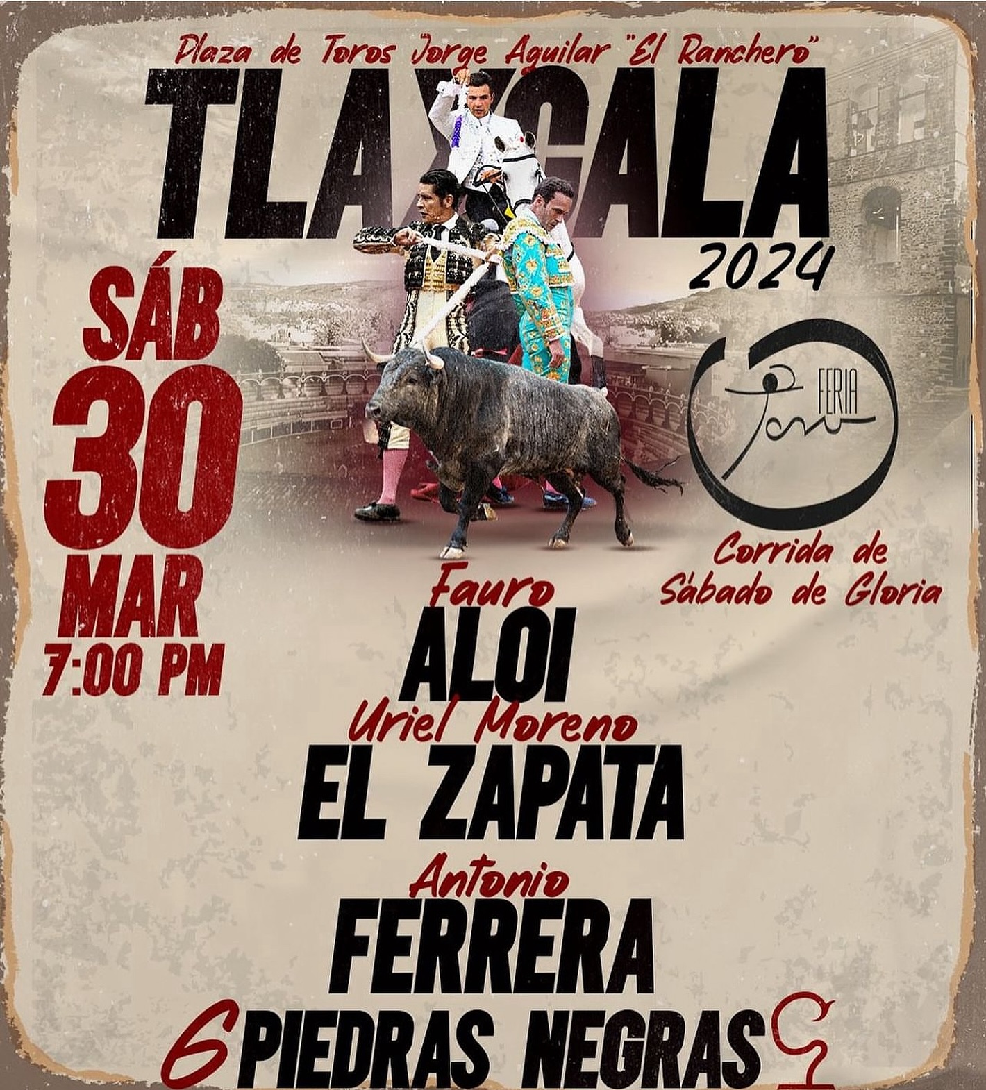 El rejoneador Fauro Aloi y los matadores Uriel Moreno «El Zapata» y el español Antonio Ferrera.