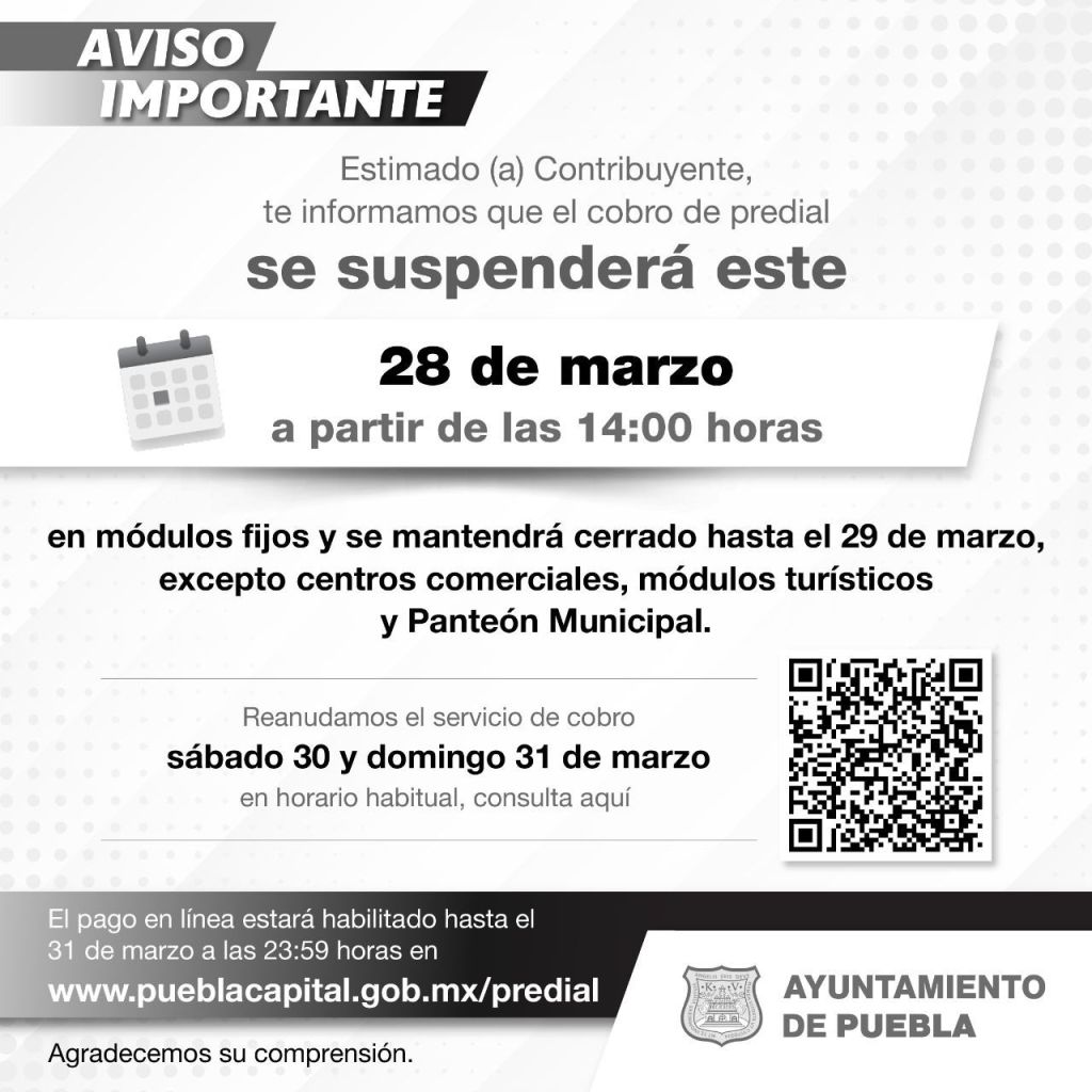 Las actividades se reanudan el sábado 30 y domingo 31 de marzo, en los horarios de atención establecidos, los cuales se pueden consultar en pueblacapital.gob.mx/tramites-y-servicios/horario-de-atencion-en-modulo-de-cobro. De igual forma, el pago en línea estará habilitado hasta el domingo 31 de marzo hasta las 23:59 horas.
