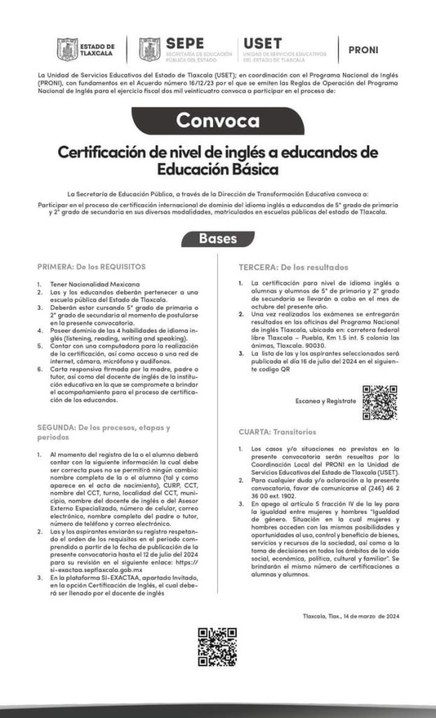 La Secretaría de Educación Pública del Estado y la Unidad de Servicios Educativos del Estado de Tlaxcala (SEPE-USET), en coordinación con el Programa Nacional de Inglés (Proni), convocan a estudiantes de quinto grado de primaria y segundo año de secundaria, en sus diversas modalidades de escuelas públicas, a participar en el proceso de certificación internacional de dominio del idioma inglés.