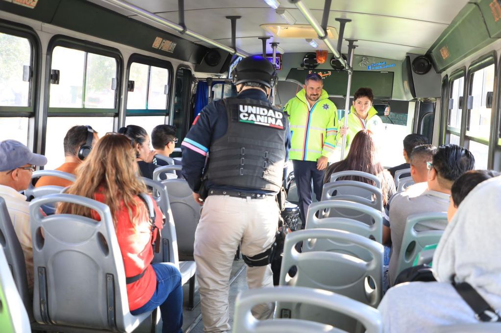 Entre las modalidades de operación, elementos policiacos realizan revisiones aleatorias para evitar la portación de armas o instrumentos prohibidos, además de inspeccionar los pasillos de las unidades del transporte público con binomios caninos.