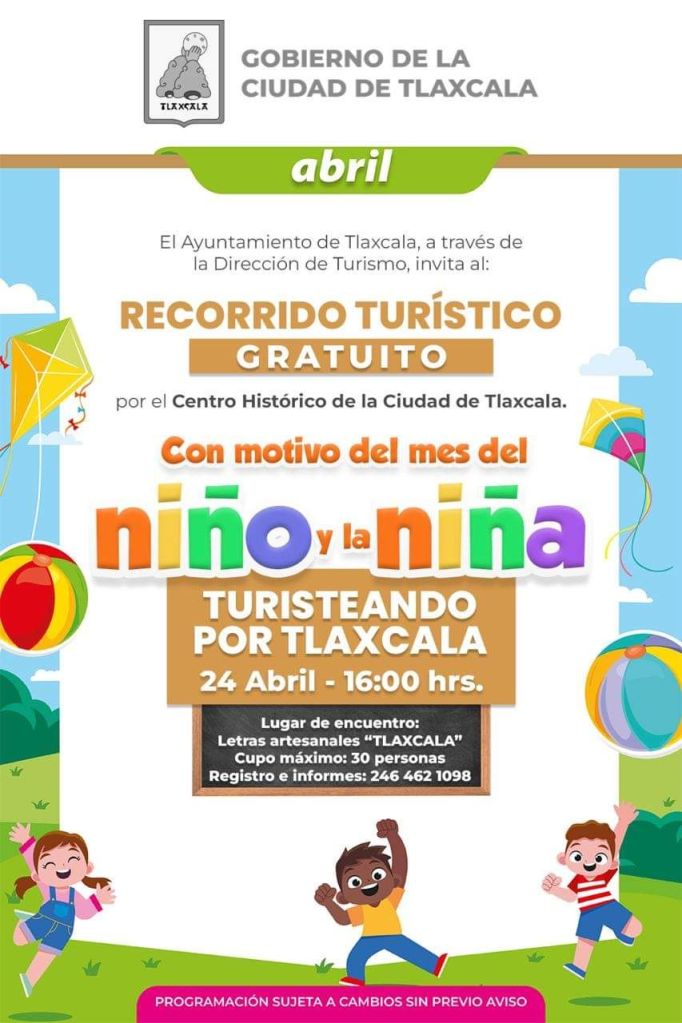 El Ayuntamiento de Tlaxcala a través de la Dirección de Turismio, en este mes de abril, invita especialmente a los niños al recorrido turístico por el Centro Histórico de Tlaxcala, este próximo 24 de abril. Registro e informes en el 24646 21098 o en la oficina de turismo.