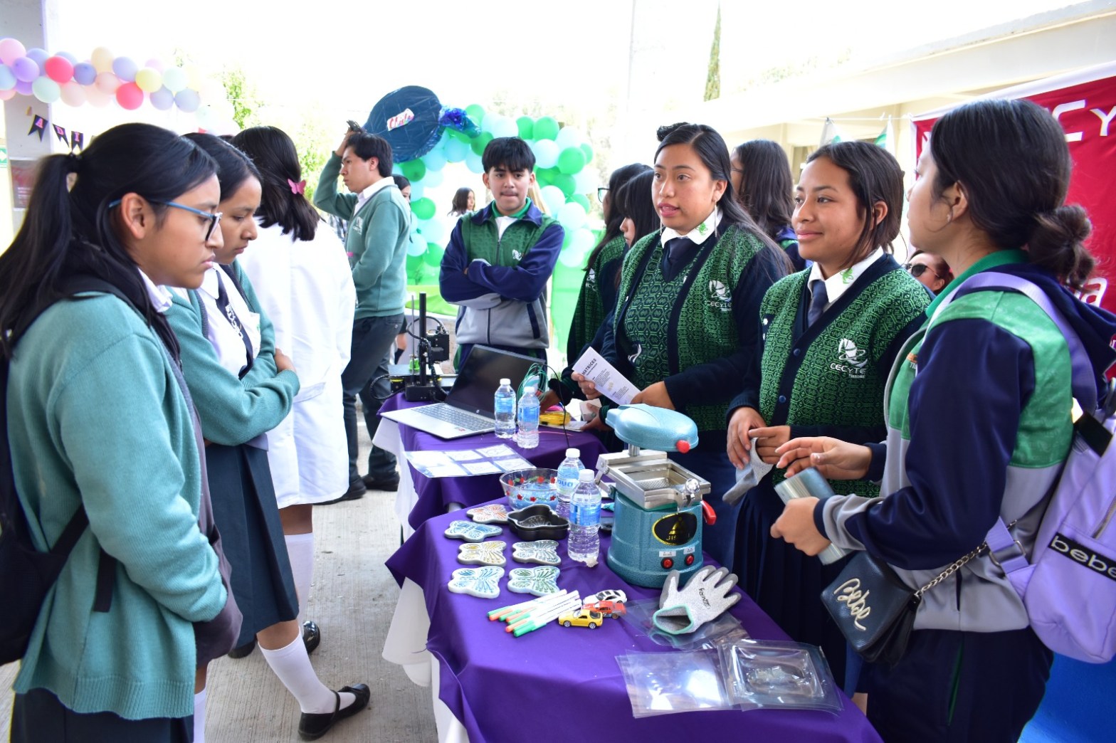 Estudiantes de la carrera técnica de Transformación de Plásticos del Colegio de Estudios Científicos y Tecnológicos del Estado de Tlaxcala y Puebla (CECyTE) realizaron un intercambio académico y estrecharon lazos de amistad en la Primera Feria del Plástico 2024, celebrado en el plantel del CECyTE Cholula.