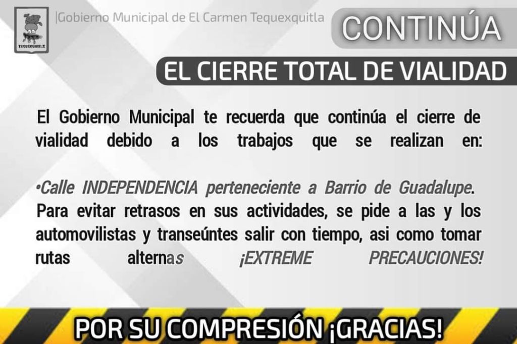 ⚠️ El Gobierno Municipal informa a la comunidad en general que continúa el CIERRE TOTAL DE VIALIDAD de la calle INDEPENDENCIA perteneciente a Barrio de Guadalupe, ¡EXTREME PRECAUCIONES! Tome rutas alternas y salga a ⏱️ tiempo para evitar retrasos en su actividades.