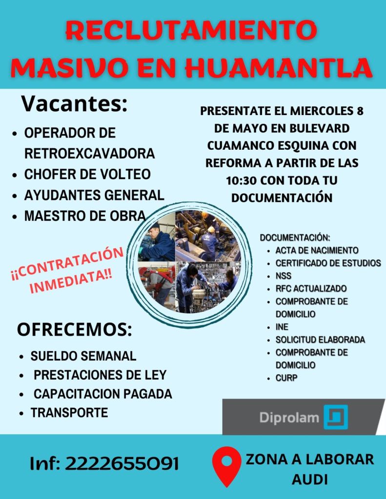 El H. Ayuntamiento de Huamantla, en coordinación con la empresa Diprolam, invita a hombres mayores de 18 años a participar en el proceso de reclutamiento de las vacantes de operador de retroexcavadora, chofer de volteo, ayudante general y maestro de obra.