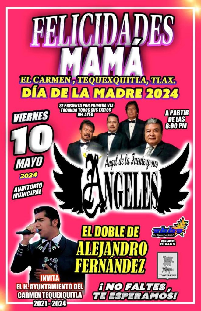El Gobierno Municipal de El Carmen Tequexquitla te invita a celebrar a MAMÁ este próximo viernes 10 de mayo de 2024, se contará con la presentación de ANGEL DE LA FUENTE Y SUS ANGELES, además del DOBLE DE ALEJANDRO FERNANDEZ, a partir de las 6:00 p.m. en el Auditorio Municipal. 🌹🌹🌹 ¡VEN Y FESTEJA A MAMÁ! 🌹🌹🌹