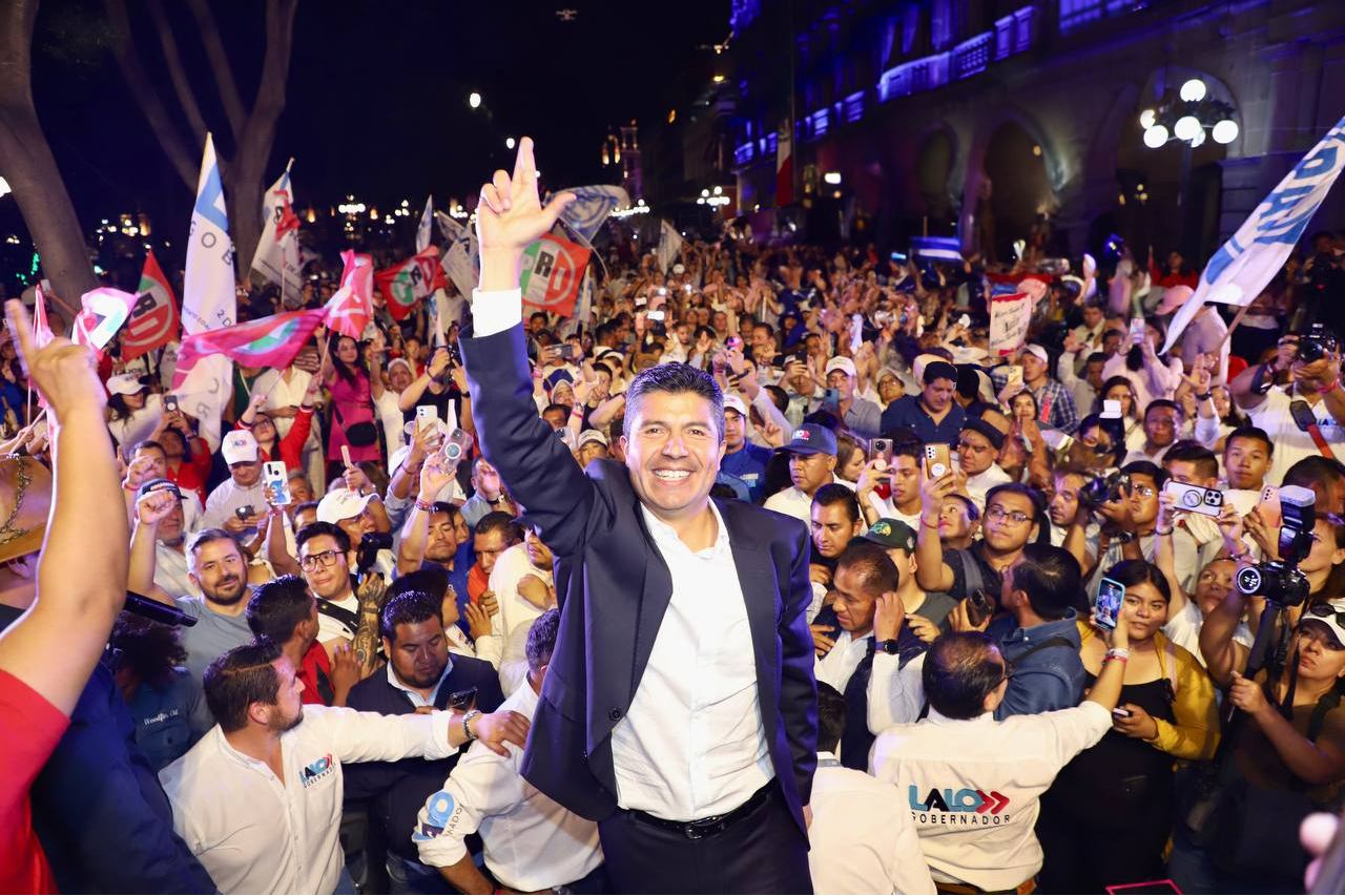 Tras ganar el Debate Puebla 2024 por la Gubernatura, Lalo Rivera -abanderado de la Coalición conformada por el PAN, PRI, PRD y PSI- celebró su victoria en compañía de simpatizantes en el Zócalo de la capital del Estado.