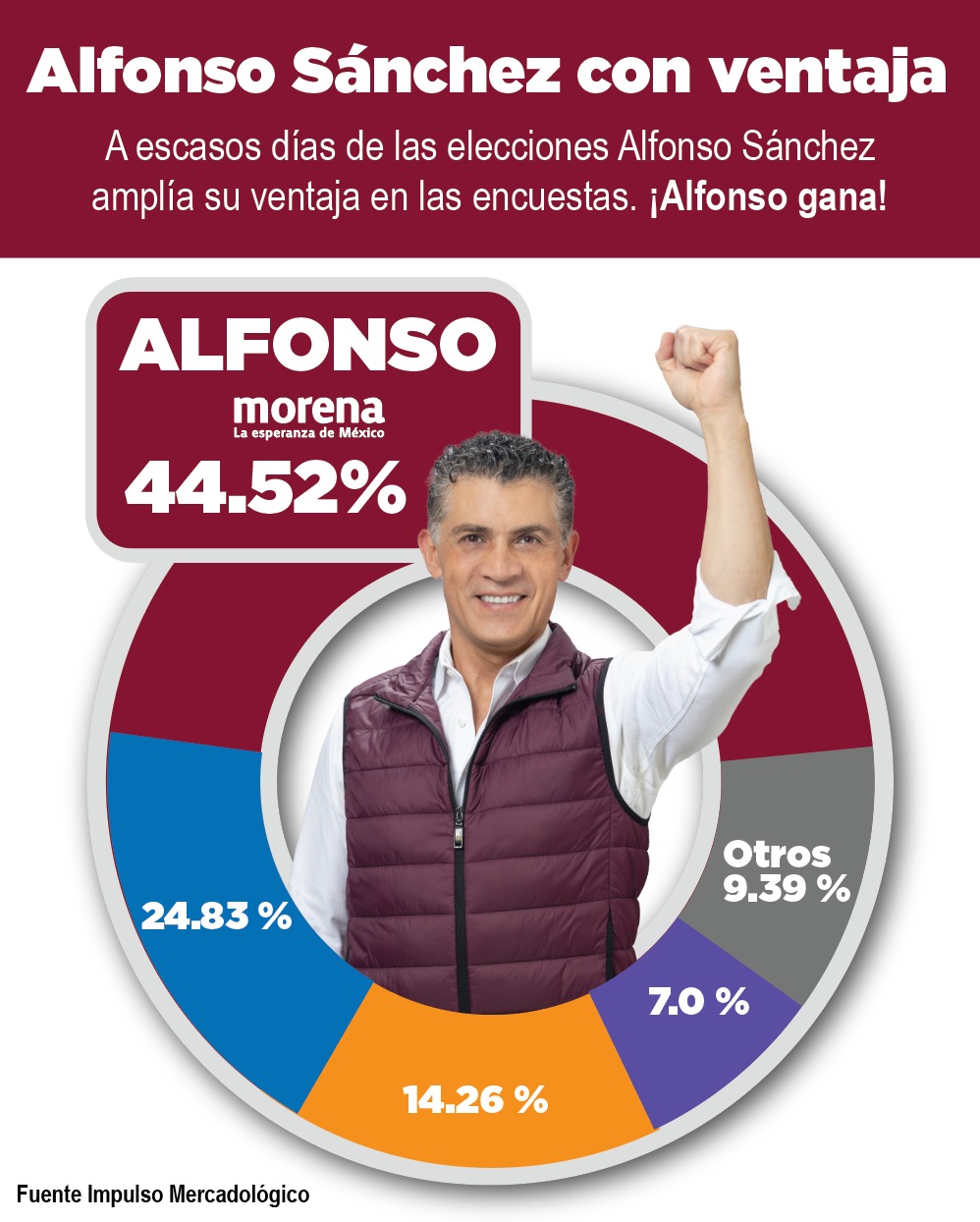 La última encuesta realizada por Impulso Mercadológico posiciona a Sánchez García en primer lugar con un 42% de intención de voto, seguido por Minerva Hernández Ramos con un 24.8%, Movimiento Ciudadano con 14.6% y el PAC con 7.0%.