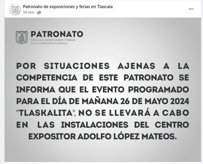 El Patronato de Exposiciones y Ferias de Tlaxcala informó en su página de Facebook que el evento no se llevaría a cabo en las instalaciones del Centro Expositor Adolfo López Mateos por «situaciones ajenas a su competencia».