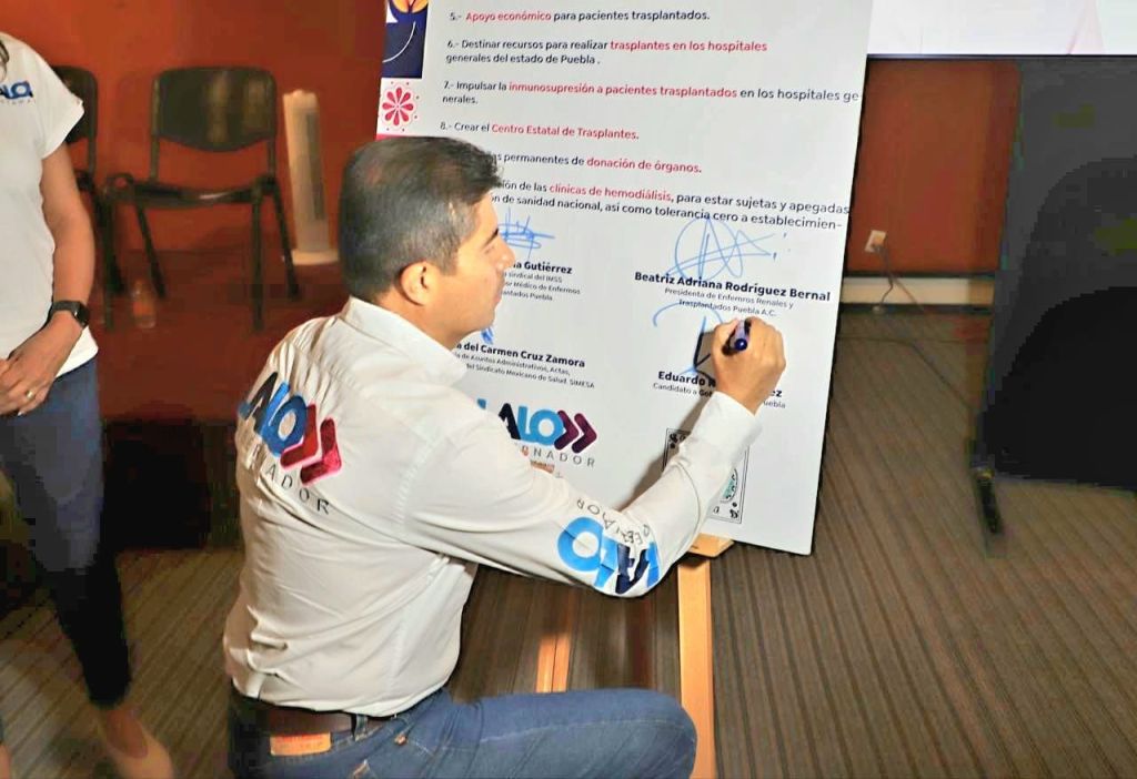 El acuerdo fue signado por Lalo Rivera; Arturo Varela, Líder de la Planilla Sindical Transformación; Beatriz Adriana Rodríguez, Presidenta de la Asociación de Enfermos Renales y Trasplantados Puebla; María del Carmen Cruz, Secretaria de Asuntos Administrativos del Sindicato Mexicano de Salud.