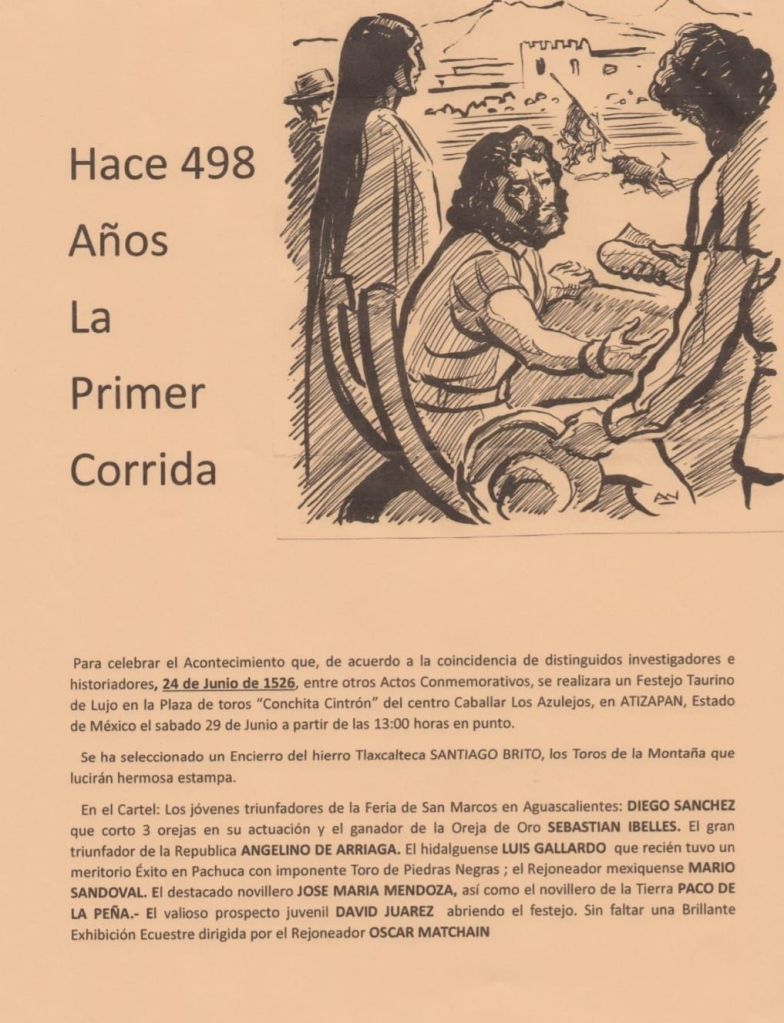 El primer Festejo Taurino en la ciudad de México, entonces llamada Tenochtitlán, tuvo lugar el 24 de junio de 1526, celebrando el regreso de Hernán Cortés de un viaje a Las Hibueras, hoy Honduras.