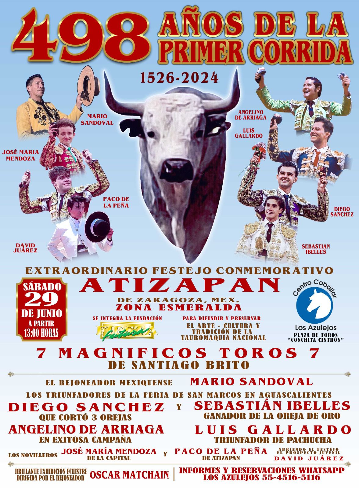 Por este motivo el próximo 29 de junio, en la «Plaza de Toros Conchita Cintrón del Centro Caballar Los Azulejos’ en Atizapán de Zaragoza, Estado de México se llevará a cabo un Festival Taurino con el objeto de celebrar los 498 años de historia de la tauromaquia en nuestro país.