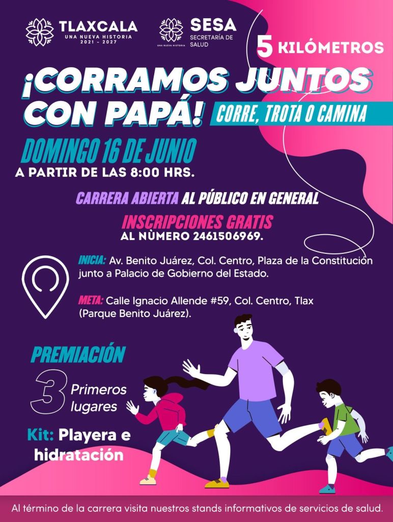 En conmemoración del Día del Padre, el Sector Salud de Tlaxcala invita a la población a participar en la carrera familiar de 5 kilómetros denominada “Corre, trota o camina con papá”, que se realizará el próximo domingo 16 de junio en las principales calles de la ciudad de Tlaxcala, a partir de las 8:00 horas.