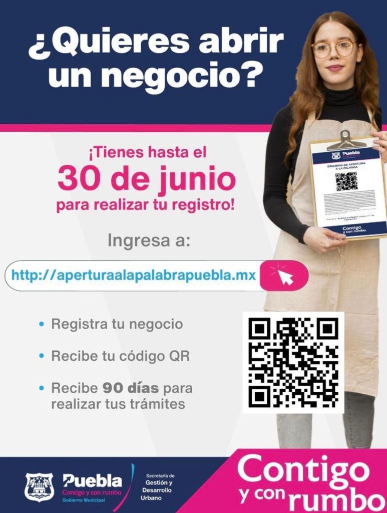 Es así que, a través de la Secretaría de Gestión y Desarrollo Urbano, se invita a la ciudadanía interesada en abrir un establecimiento comercial a realizar su registro en la plataforma http://www.aperturaalapalabrapuebla.mx durante el mes de junio.