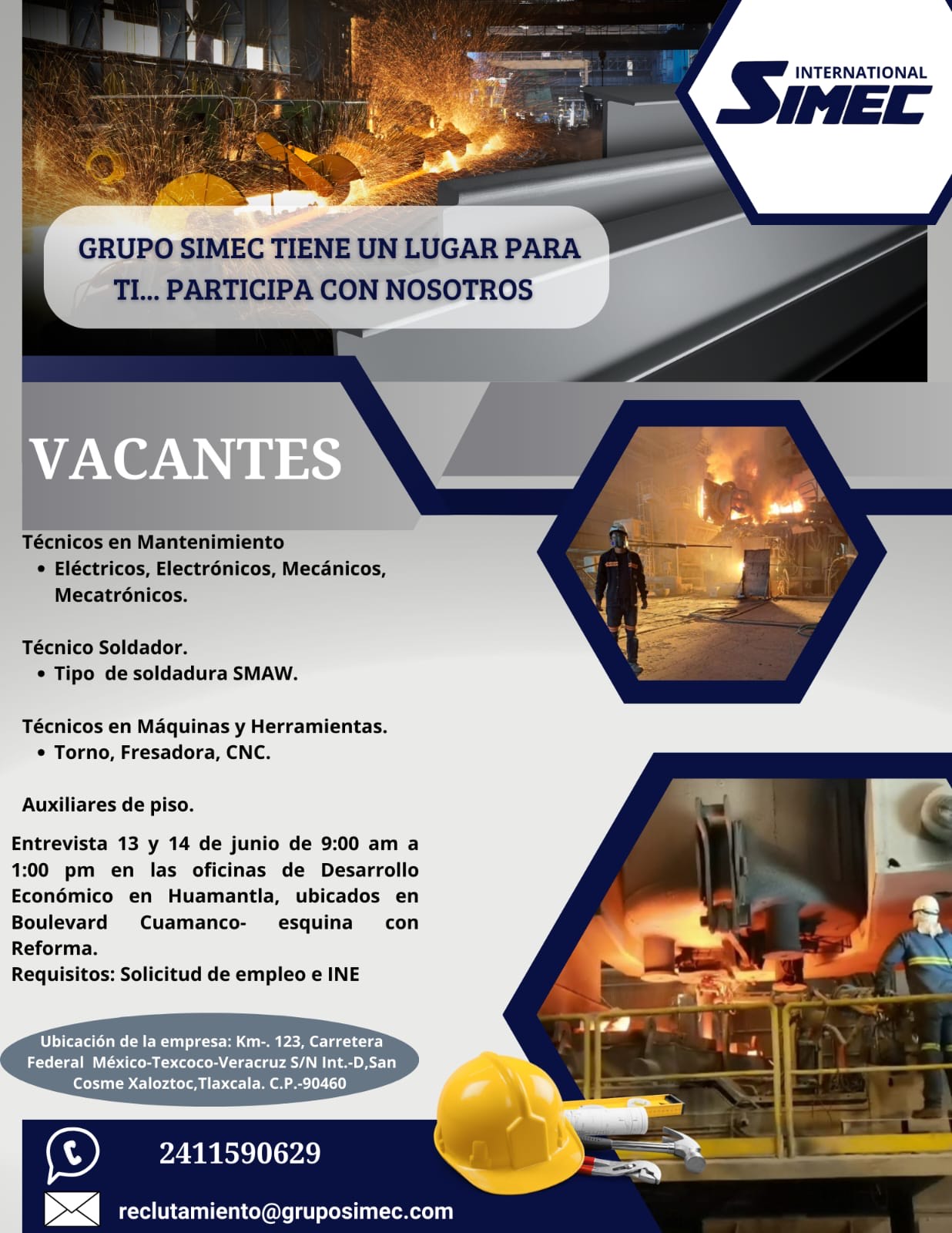 El H. Ayuntamiento de Huamantla, encabezado por Luz María Calva Pimentel, en colaboración con la empresa Simec, líder en la producción y procesamiento de acero, anuncian oportunidades de empleo.