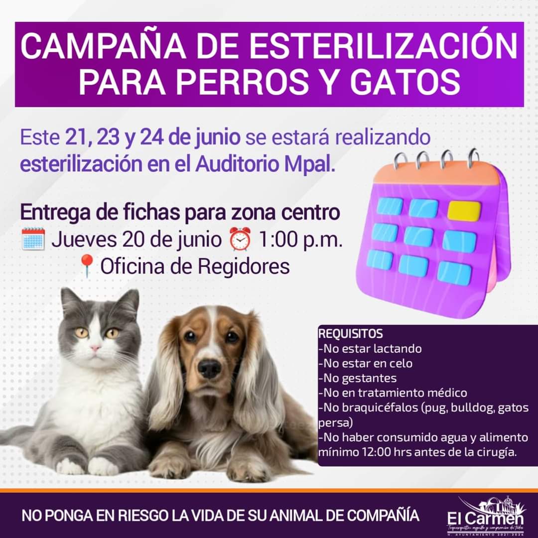 El Gobierno Municipal en coordinación con la Regiduría de salud, invita a la población en general a asistir a la entrega de fichas para esterilización canica y felina en zona centro el próximo: