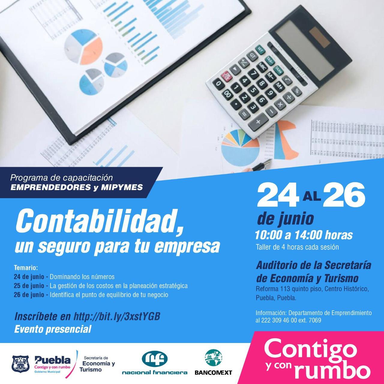 Continúa el apoyo a las y los emprendedores por parte del Ayuntamiento de Puebla — encabezado por Adán Domínguez Sánchez—, ya que a través de la Secretaría de Economía y Turismo se llevará a cabo el taller “Contabilidad, un seguro para tu empresa”, del 24 al 26 de junio del presente año.