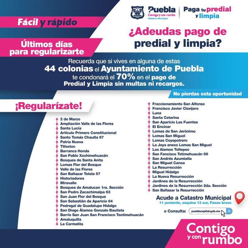 El Gobierno Municipal, a través de la Tesorería, continúa ofreciendo el estímulo fiscal del 70 por ciento de descuento en el pago del Impuesto de Predial y de Derechos de Limpia en 44 colonias de alta marginación y vulnerabilidad de Puebla Capital para regularizar su adeudo y apoyar en la economía de las y los contribuyentes.