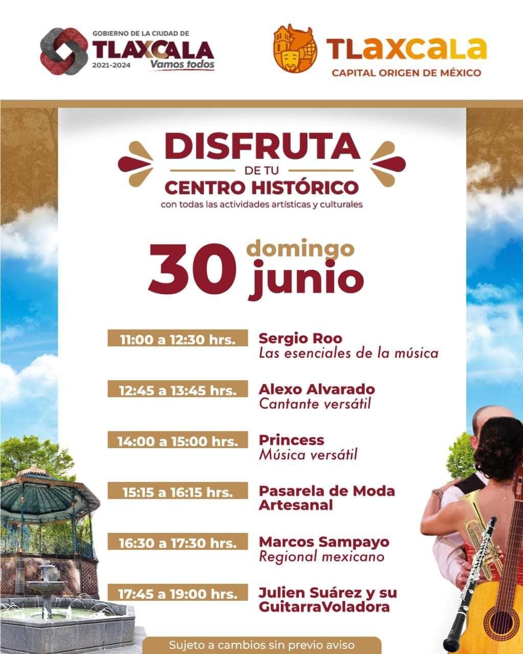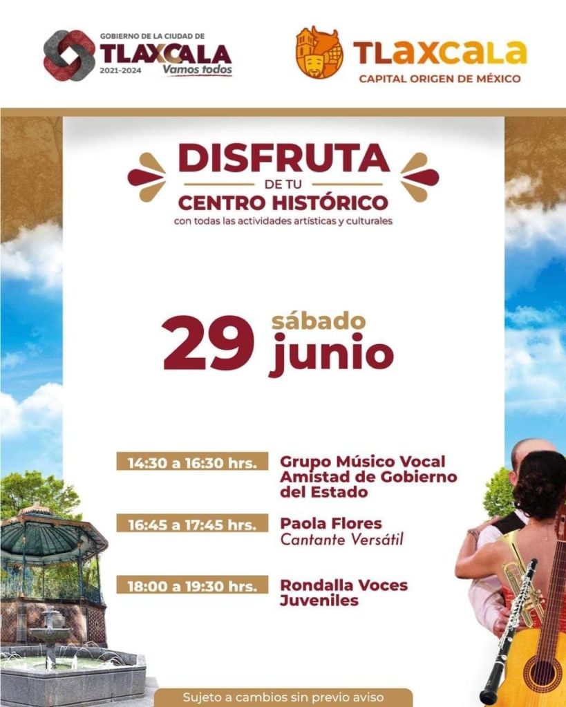 El Ayuntamiento de Tlaxcala te invita a disfrutar este fin de semana del centro histórico de nuestra ciudad, con las actividades artísticas y culturales que se llevan a cabo a través de la dirección de turismo y sumado todo esto al pabellón artesanal en la Plaza de la Constitución y el mercado de artesanos en la calle Xicohténcatl número 11 a espaldas de la presidencia municipal