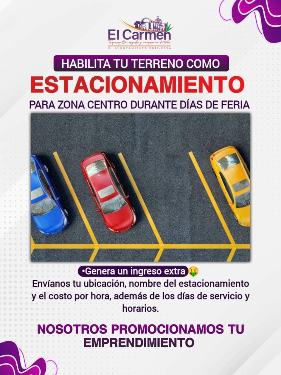 El Gobierno Municipal de El Carmen Tequexquitla invita a la comunidad en general que cuente con espacios amplios o terrenos, que puedan ser utilizados como estacionamiento en zona centro.