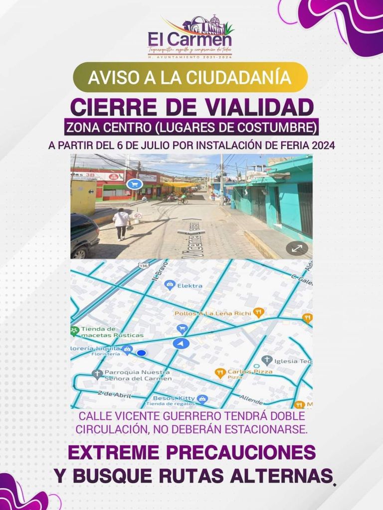 👁️ A PARTIR DEL DÍA SÁBADO 06 DE JULIO DE 2024, se llevará a cabo el cierre de vialidad en toda la zona centro por instalación de Feria 2024.