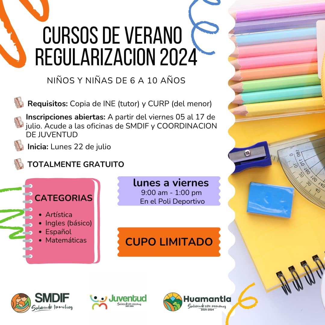 El Sistema municipal para el Desarrollo Integral de la Familia (SMDIF) de Huamantla, con la Coordinación de Juventud del municipio, invitan a las niñas y niños de 6 a 10 años de edad a participar en sus cursos de verano de “Regularización 2024”.