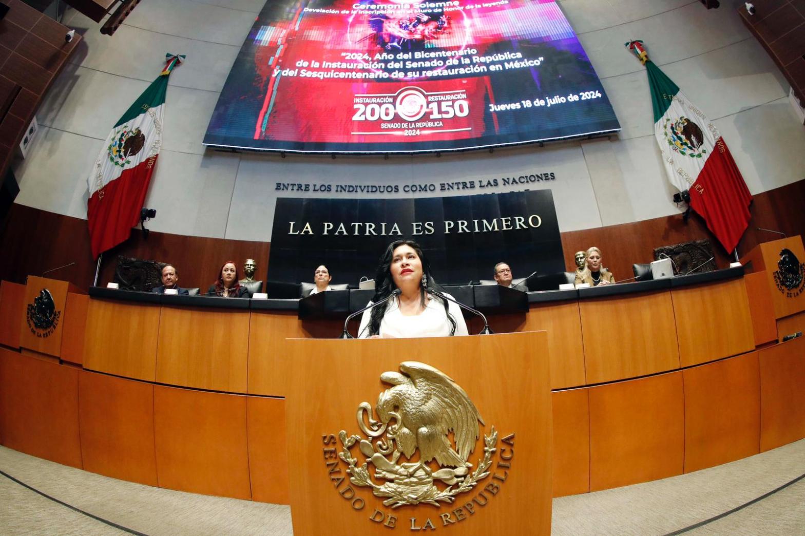 • Encabeza la senadora Ana Lilia Rivera ceremonia solemne para develar, en el Muro de Honor, la leyenda “2024, Año del Bicentenario de la instauración del Senado de la República y del Sesquicentenario de su restauración en México”