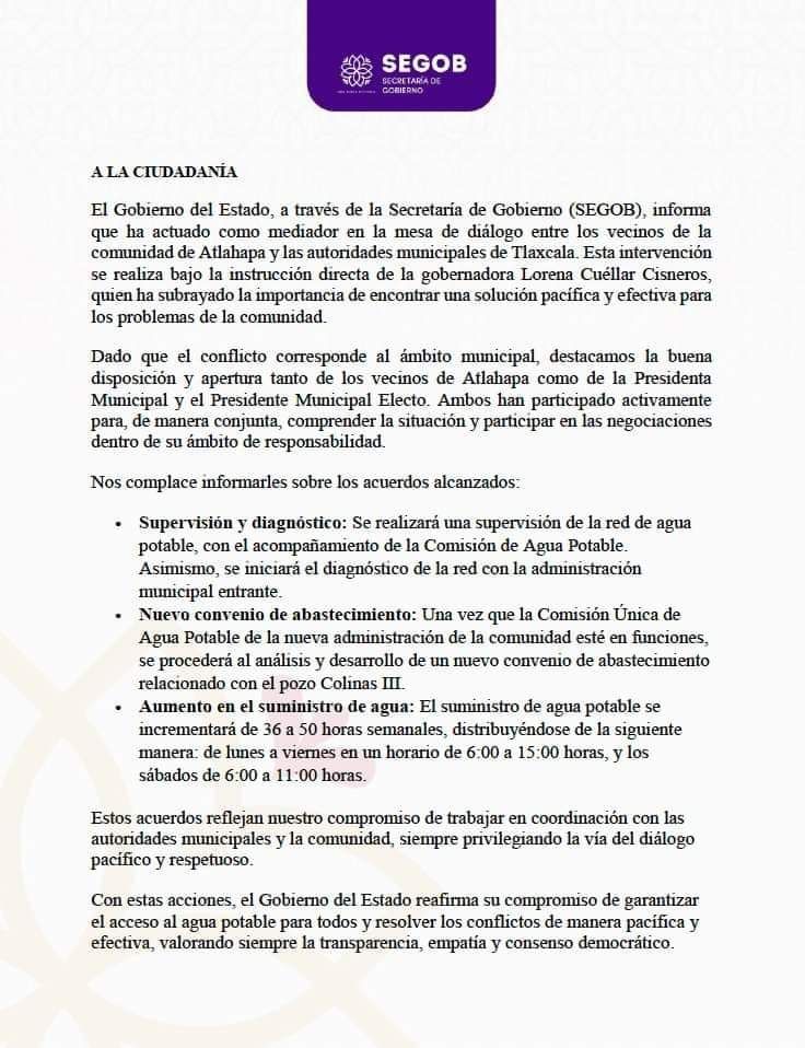 El Ayuntamiento de Tlaxcala, comparte los acuerdos alcanzados en la mesa de dialogo con los habitantes de San Sebastián Atlahapa, donde el Gobierno del estado a través de la SEGOB intervino para ello.