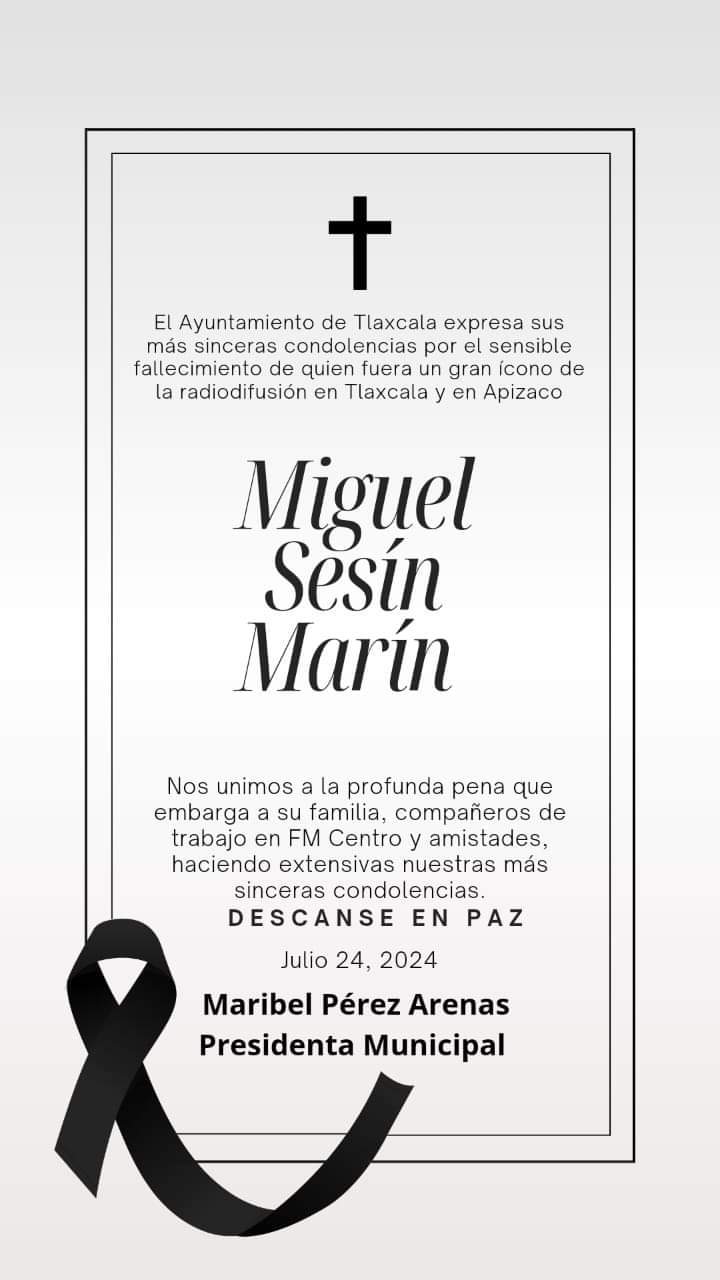 Quienes colaboramos en el Ayuntamiento de Tlaxcala, nos unimos a la pena que embarga a la familia de Don Miguel Sesín Marín, por su sensible fallecimiento. Una voz que dejó huella en la radiodifusión en Tlaxcala y en Apizaco, a través de la señal de FM Centro 100.3