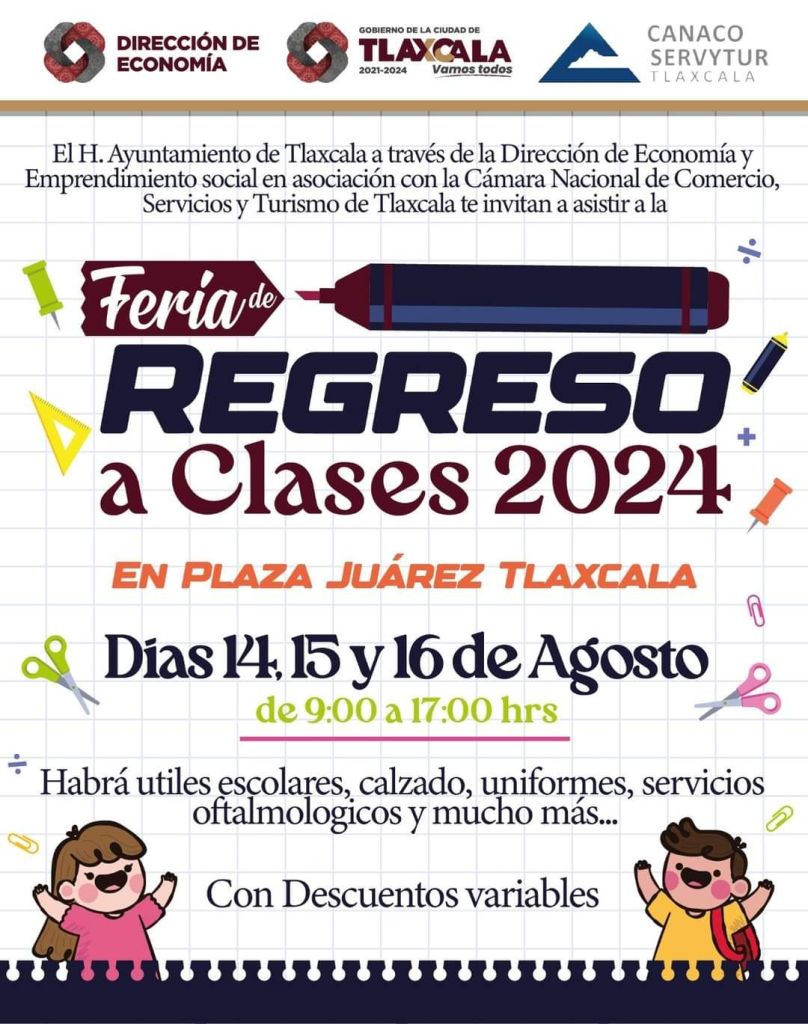 ✏️ El Ayuntamiento de Tlaxcala invita al público en general a participar en la «Feria de Regreso a Clases 2024», en donde podrás surtir la lista de útiles escolares a un buen precio y con descuentos. Además habrá servicios de uniformes escolares, oftalmología, calzado y mucho más.