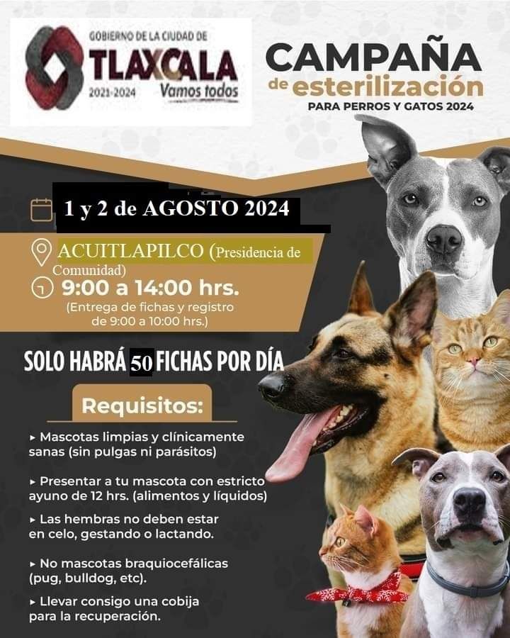 🐶🐱El ayuntamiento de Tlaxcala invita al público en general a participar en la campaña de esterilización de perros y gatos en la comunidad de Acuitlapilco, los días 1 y 2 de agosto.
