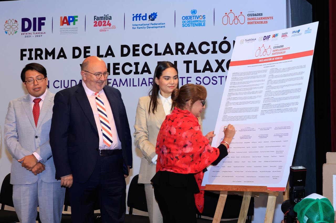 Con la finalidad de fomentar la inclusión de las familias en el desarrollo de comunidades y ciudades, situándolas en el centro de las políticas públicas, la gobernadora Lorena Cuéllar Cisneros firmó la Declaración de Venecia en Tlaxcala, entre la Organización de las Naciones Unidas (ONU), el Sistema Estatal para el Desarrollo Integral de la Familia (Sedif) y presidentes municipales electos.