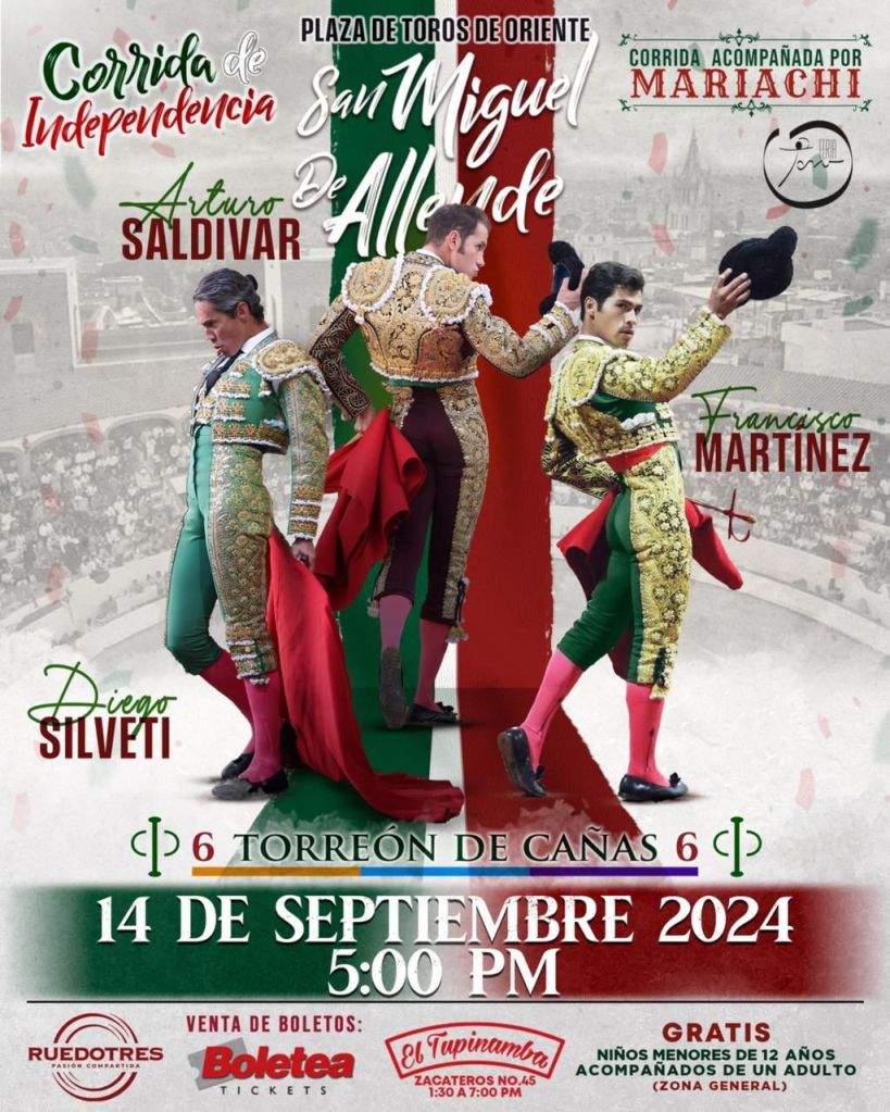 Para la compra de los boletos en físico para este festejo taurino será a partir de este vierrnes en el restaurante “El Tupinamba”, ubicado en Zacateros #45, de la Colonia Centro, en San Miguel de Allende y, en línea, a través de Boletea. Los niños menores de 12 años entrarán gratis en zona general acompañados de un adulto