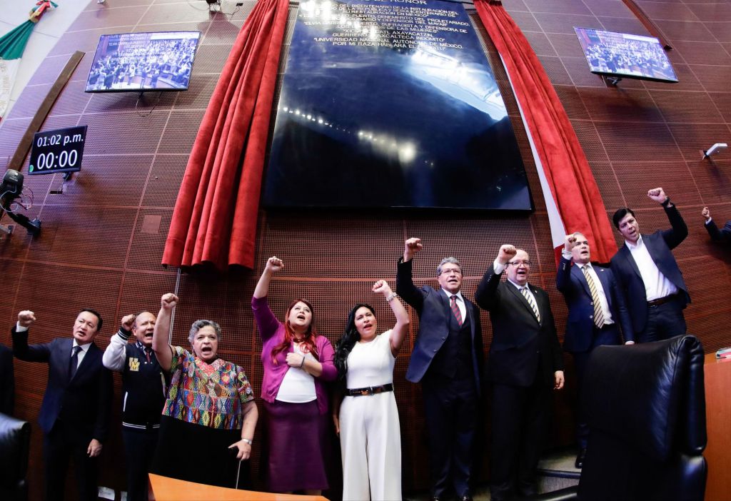 En ceremonia solemne, la presidenta de la Mesa Directiva, Ana Lilia Rivera Rivera, acompañada de senadoras, senadores, y de la comunidad universitaria, develaron en el Muro de Honor la leyenda: «Universidad Nacional Autónoma de México. Por mi raza hablará el espíritu”.