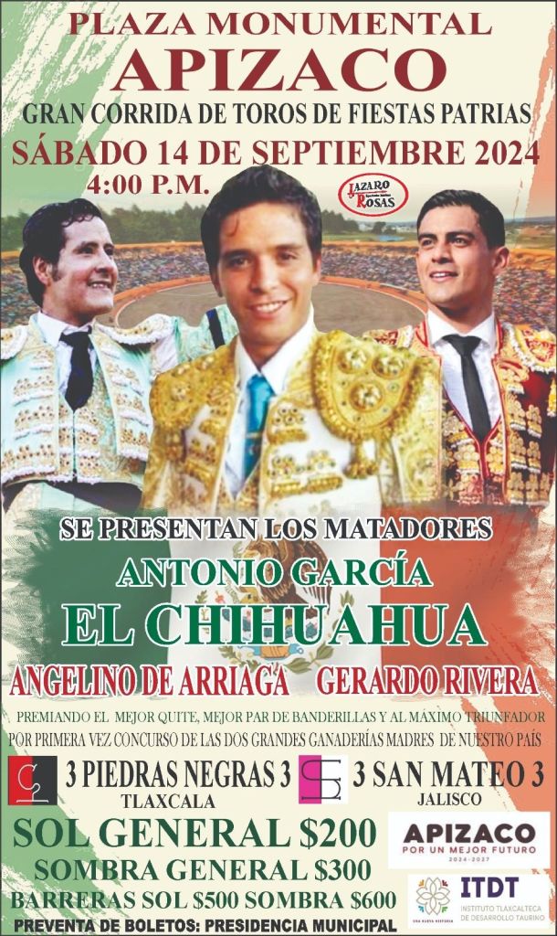 Este día el Director de Asuntos Taurinos del municipio de Apizaco Lázaro Rosas mediante Redes Sociales dio a conocer La Gran Corrida de Toros de Fiestas Patrias que habrá de realizarse el próximo sábado 14 de septiembre a las 4:00 P.M. en la Plaza Rodolfo Rodríguez «El Pana».