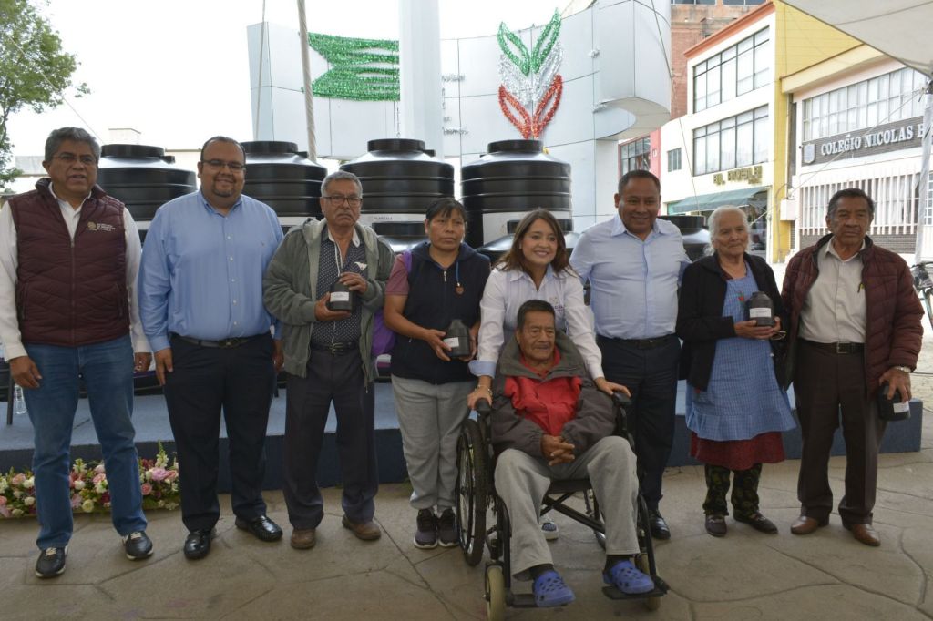 La Licenciada Fernanda Espinosa de los Monteros, Presidenta Honorífica del Comité Consultivo de Bienestar Estatal; el Ingeniero Rubén Espinosa Mejía, Director de Participación Social; el Presidente de Apizaco, Javier Rivera Bonilla, y el Secretario de Ayuntamiento, Juan Pablo Morales Rico; presidieron la entrega de 176 tinacos que beneficiarán a las familias apizaquenses que más lo necesitan para mejorar su calidad de vida.