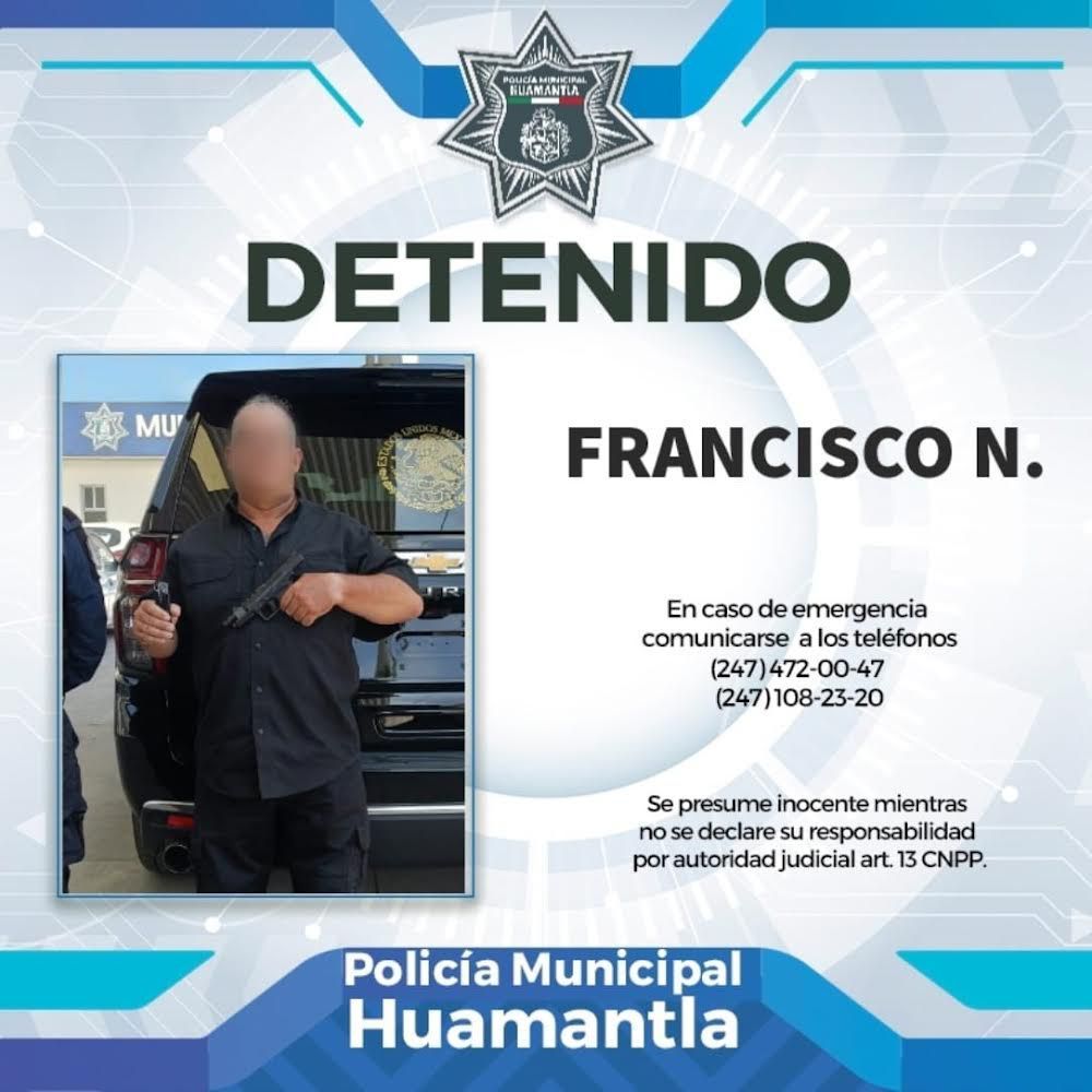 Durante la revisión de sus documentos, el sujeto expuso un objeto metálico con las características de un arma de fuego y al ser cuestionado sobre el permiso para portarla, el conductor, identificado como Francisco N., declaró no tenerlo, por lo que al estar ante la posible comisión de un delito, los oficiales procedieron a asegurarlo e informarle el motivo de su detención y sus derechos.
