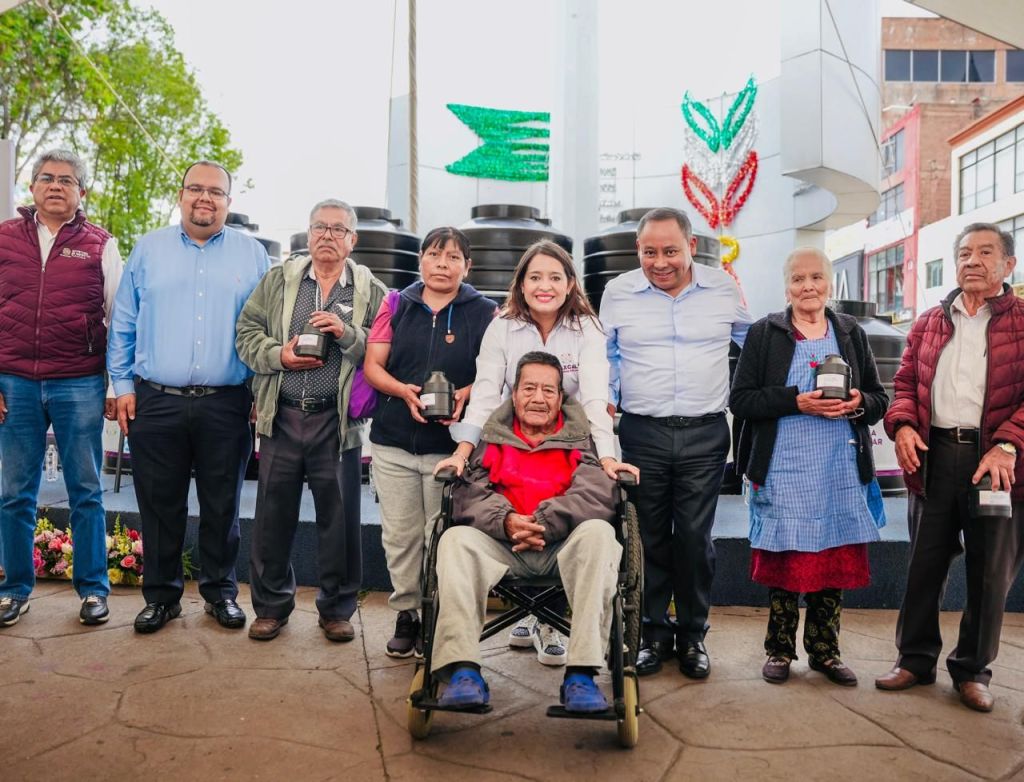 Como parte del evento, Fernanda Espinosa de los Monteros Cuéllar entregó simbólicamente cinco tinacos con capacidad de almacenar mil 200 litros cada uno, de los 174 apoyos que se distribuirán a familias apizaquenses.