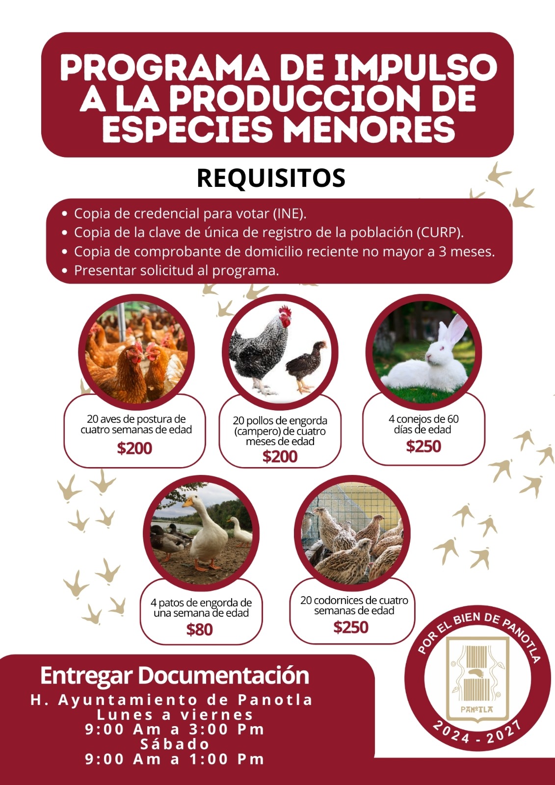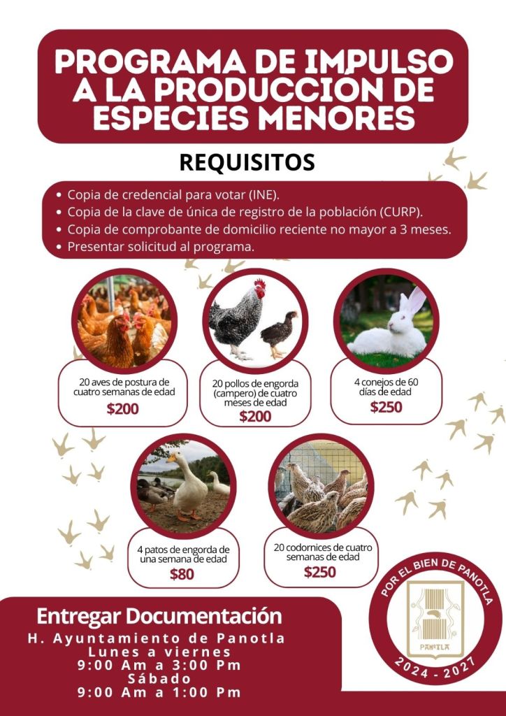 El Ayuntamiento de Panotla, a través de la Dirección de Gestión de Proyectos, se complace en anunciar la apertura del programa para la adquisición de paquetes de especies menores, que incluye aves de postura, pollos de engorda, conejos, patos y codornices.