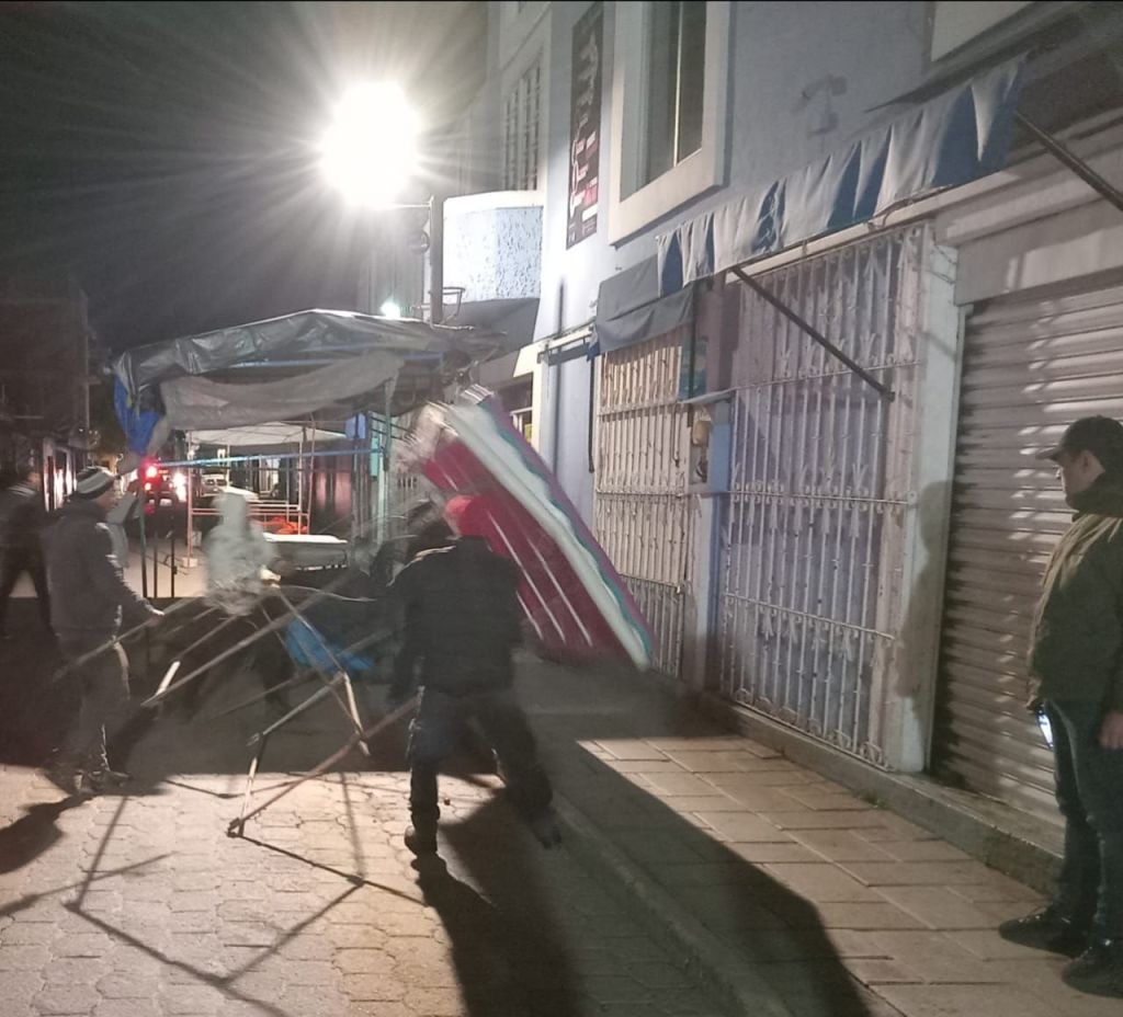 En atención a las peticiones de ciudadanos, organizaciones civiles, representantes de la iniciativa privada y con base en dictámenes de Protección Civil y del Bando de Policía y Gobierno, el Ayuntamiento de Tlaxcala llevó a cabo la madrugada de este miércoles, el retiro de estructuras de puestos ambulantes que estaban colocadas sobre las calles Zitlapopócatl y Guillermo Barroso, en la capital del estado, con el objetivo de regular el comercio en la ciudad.
